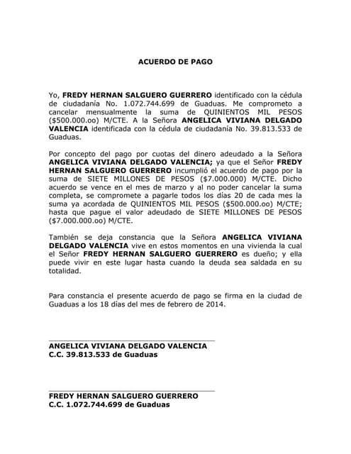 Descripción de las partes: Es importante identificar claramente a las partes que participan en el acuerdo de pago, incluyendo nombres completos, números de documento y domicilios.